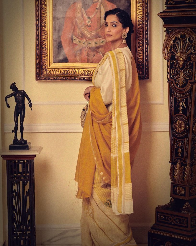 Sonam Kapoor Ahuja, known for her fashion-forward choices, experimented with a Khadi saree. Her bold combination of colors and modern accessories showcased Khadi’s adaptability to contemporary styles.