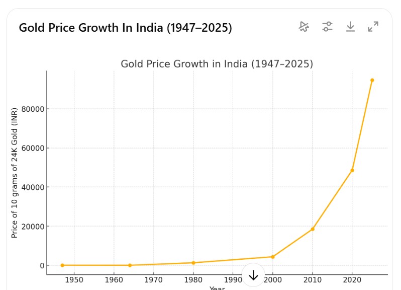 Here’s the visual journey of India’s gold prices from 1947 to 2025 — you can clearly see the strong, steady rise that reinforces why gold is viewed as a symbol of security and long-term prosperity in Indian households.